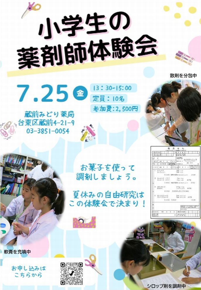 みどり薬局 Open Pharmacy 始動! 薬局はどんなところ? 薬剤師はどんなことをするの? イベント参加の体験を通して、 患者さん、学生さん、地域の方、医療者の方、介護者の方に、 薬局を知っていただきたいと考えています。 気軽に参加できるさまざまなイベントを定期的に開催していきます。 今後ともよろしくお願いします。