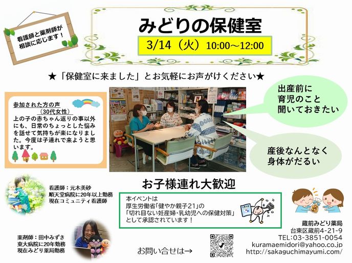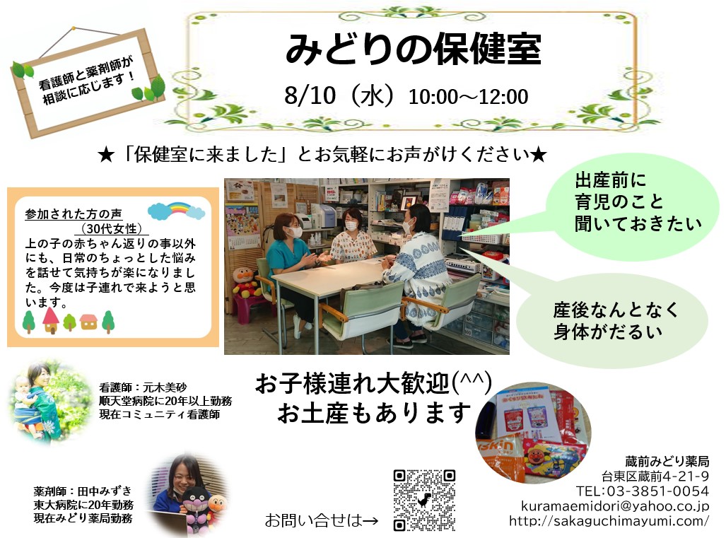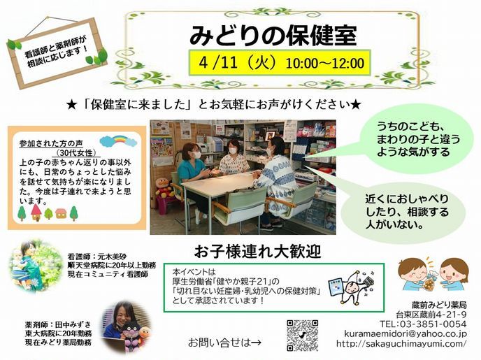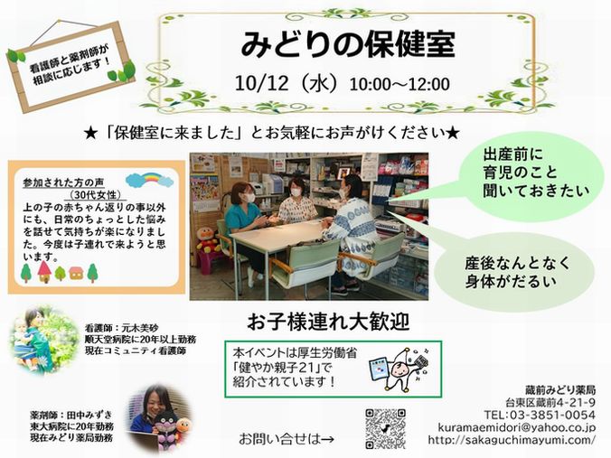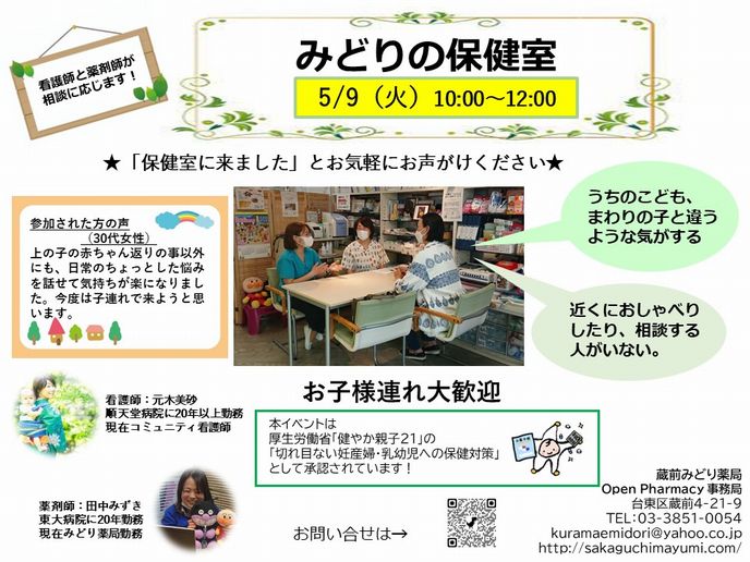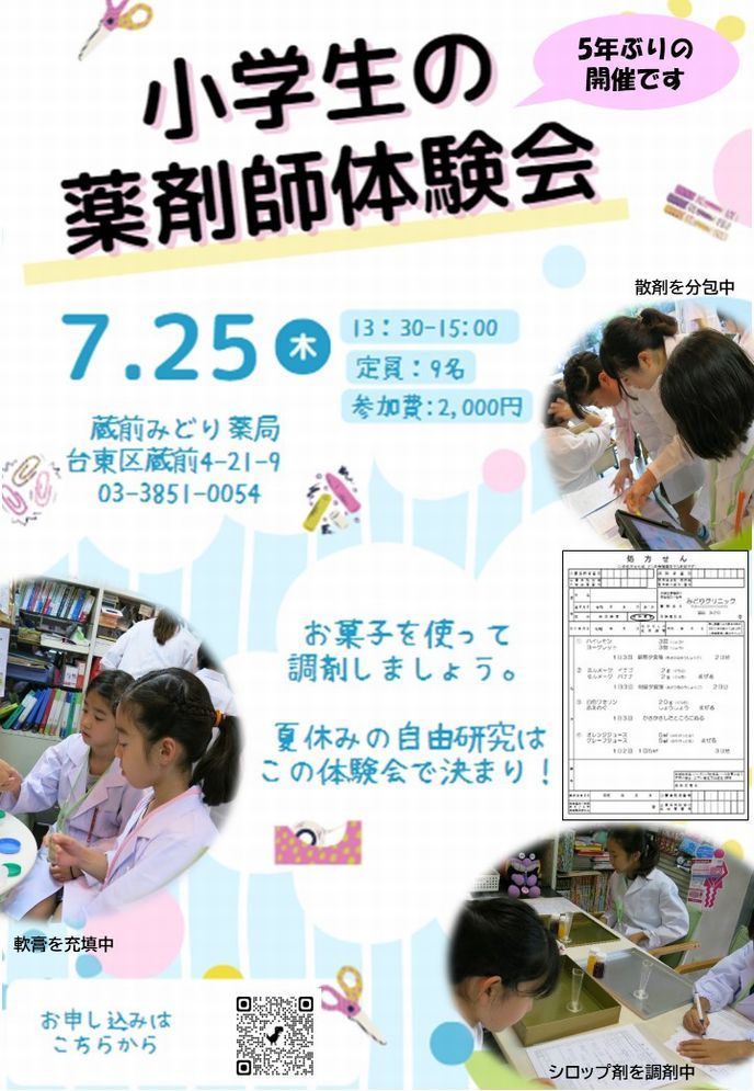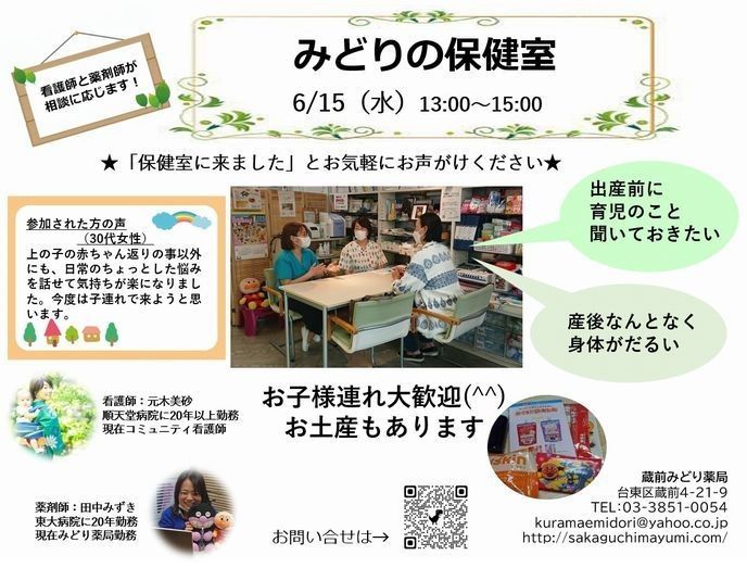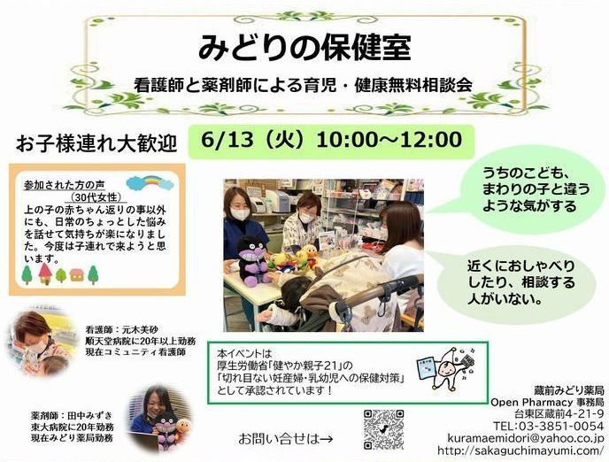 みどり薬局 Open Pharmacy 始動! 薬局はどんなところ? 薬剤師はどんなことをするの? イベント参加の体験を通して、 患者さん、学生さん、地域の方、医療者の方、介護者の方に、 薬局を知っていただきたいと考えています。 気軽に参加できるさまざまなイベントを定期的に開催していきます。 今後ともよろしくお願いします。