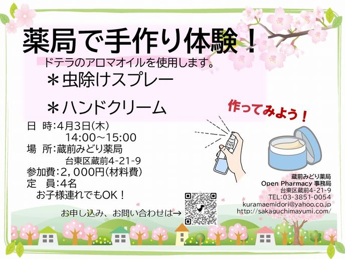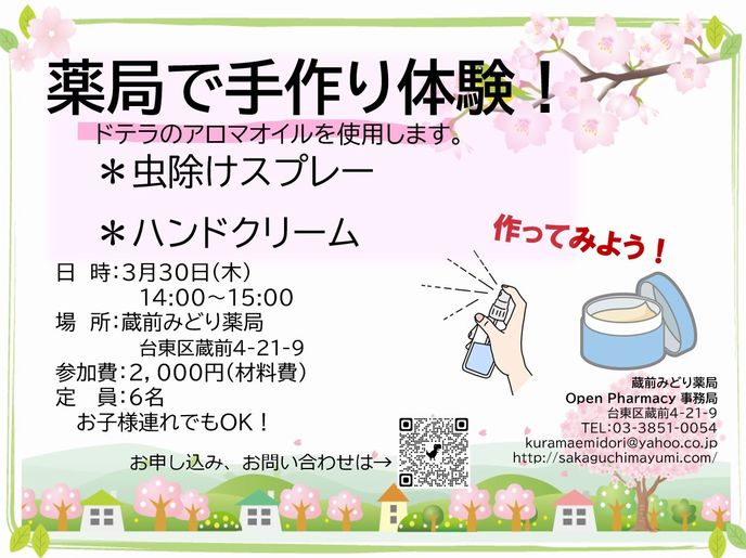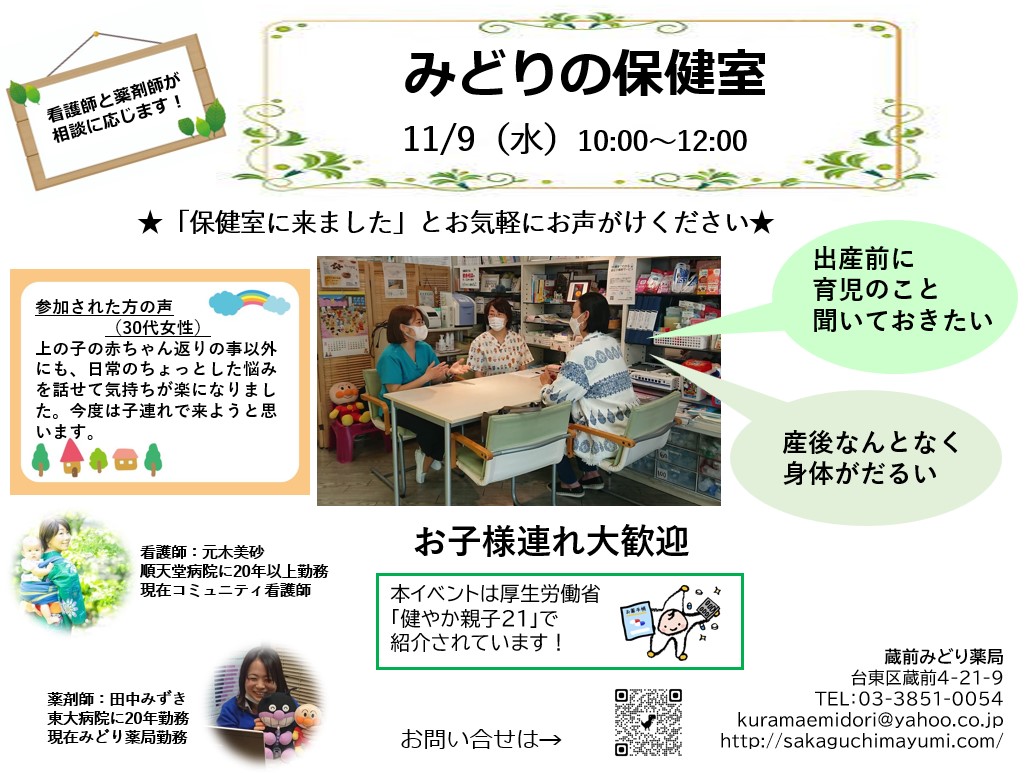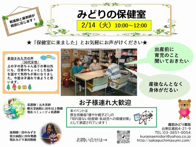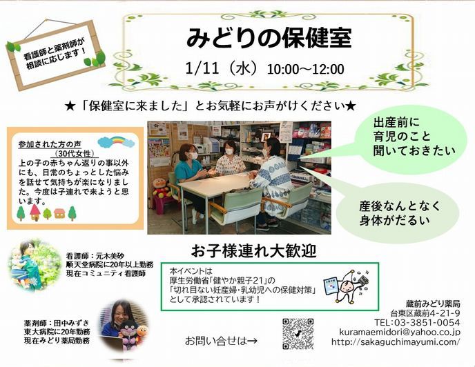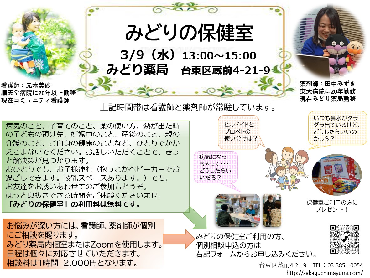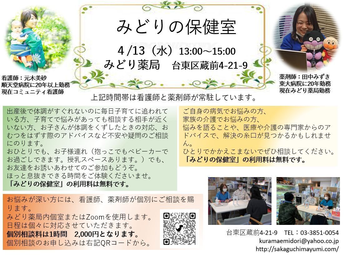 みどり薬局 Open Pharmacy 始動! 薬局はどんなところ? 薬剤師はどんなことをするの? イベント参加の体験を通して、 患者さん、学生さん、地域の方、医療者の方、介護者の方に、 薬局を知っていただきたいと考えています。 気軽に参加できるさまざまなイベントを定期的に開催していきます。 今後ともよろしくお願いします。